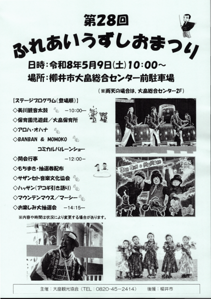 2026年5月9日(土曜日)10時から、瀬戸山道そばの大畠総合センター前駐車場にて「第28回ふれあいうずしおまつり」が開催されます。雨天時は大畠総合センター2階。主催は大畠観光協会。