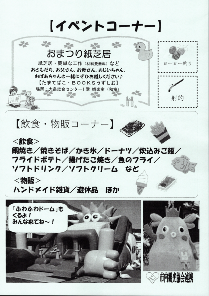 | 【飲食・物販コーナー】 〈飲食〉 鯛焼き/焼きそば/かき氷/ドーナツ/炊込みご飯/フライドポテト/揚げたこ焼き/魚のフライ/ソフトドリンク/ソフトクリーム など 〈物販〉 ハンドメイド雑貨/遊休品 ほか |